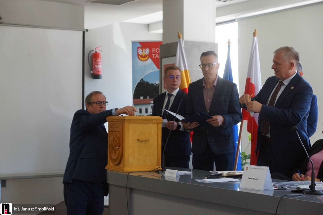 Na zdjęciu członkowie komisji skrutacyjnej podczas głosowania na starostę tarnowskiego. Obok wiceprzewodnicząca Rady Powiatu Ewa Kubisztal oraz przewodniczący Paweł Smoleń.