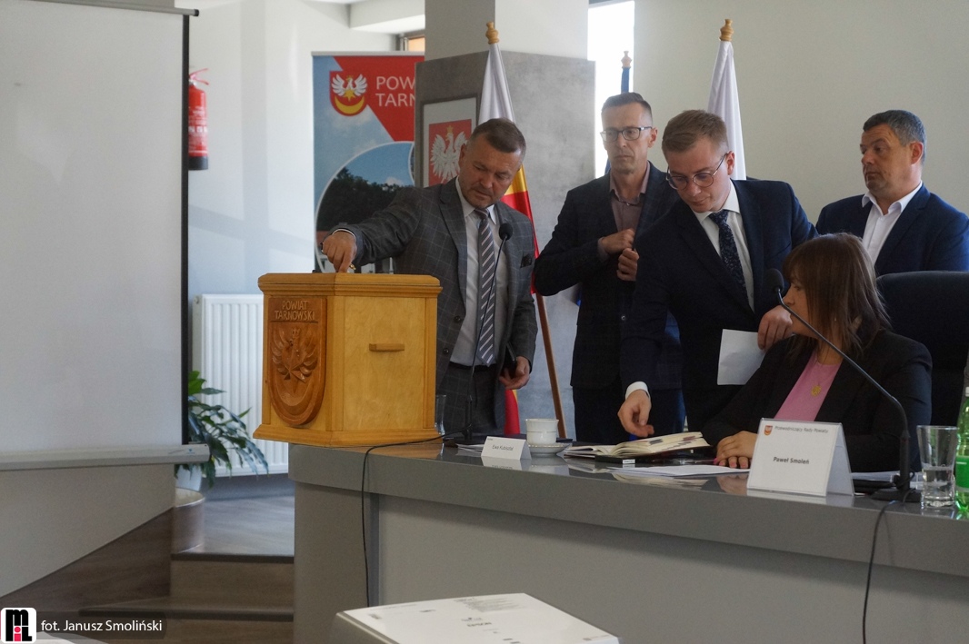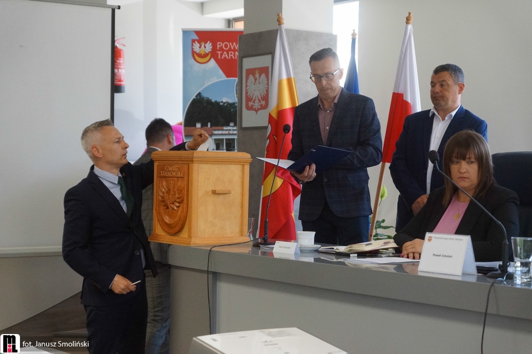 Na zdjęciu członkowie komisji skrutacyjnej podczas głosowania na starostę tarnowskiego. Obok wiceprzewodnicząca Rady Powiatu Ewa Kubisztal oraz przewodniczący Paweł Smoleń.