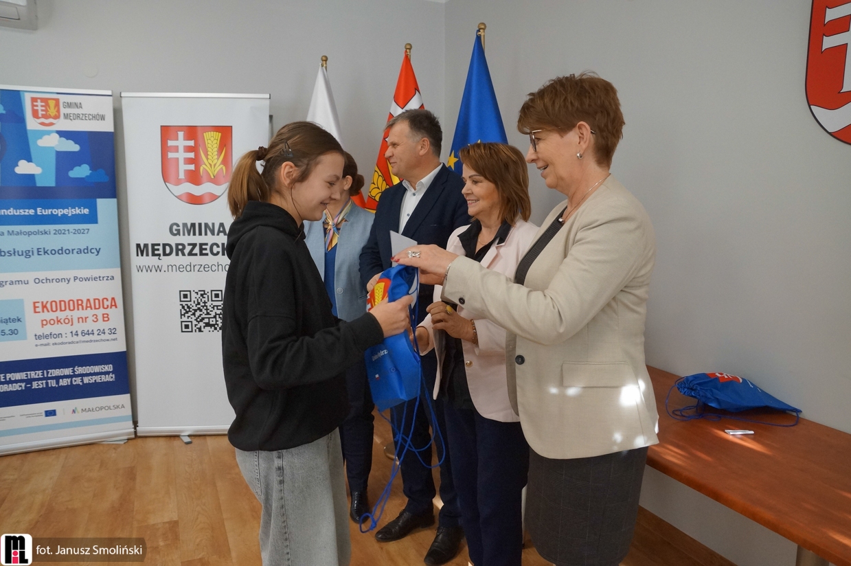 W uroczystym wręczeniu nagród uczestniczyli przedstawiciele samorządu: wójt gminy Mędrzechów Krzysztof Korzec, sekretarz gminy Barbara Pobiegło, przewodnicząca Rady Gminy Barbara Brożek oraz skarbnik Ewa Klimaj. Samorządowcy pogratulowali wszystkim uczestnikom konkursu, podkreślając znaczenie edukacji klimatycznej już od najmłodszych lat.