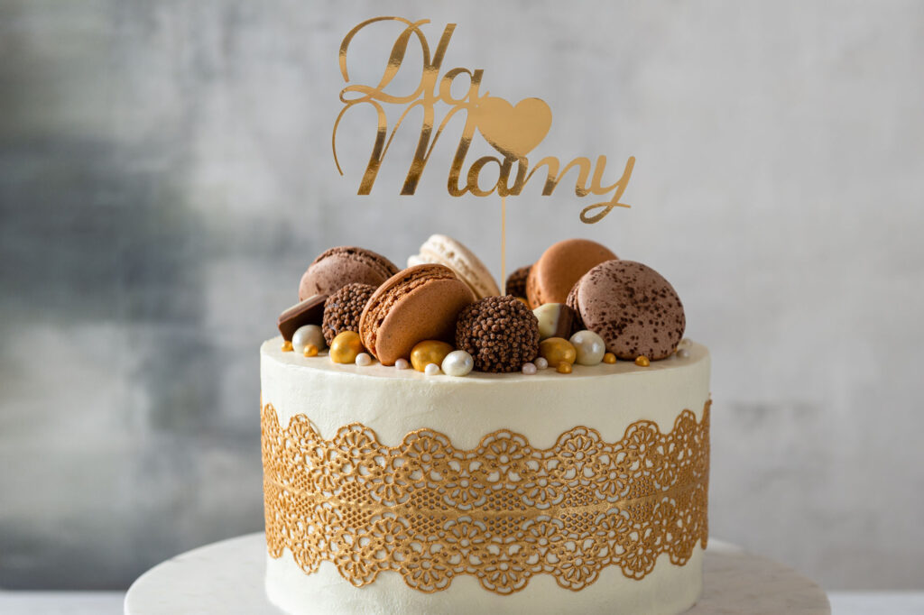 Zamiast łączyć wiele stylów, warto postawić na jeden dominujący akcent: polewa typu drip, złote lub metaliczne detale, kwiaty, owoce czy topper z napisem. To właśnie jeden wyrazisty element przyciąga uwagę i nadaje całości charakter.